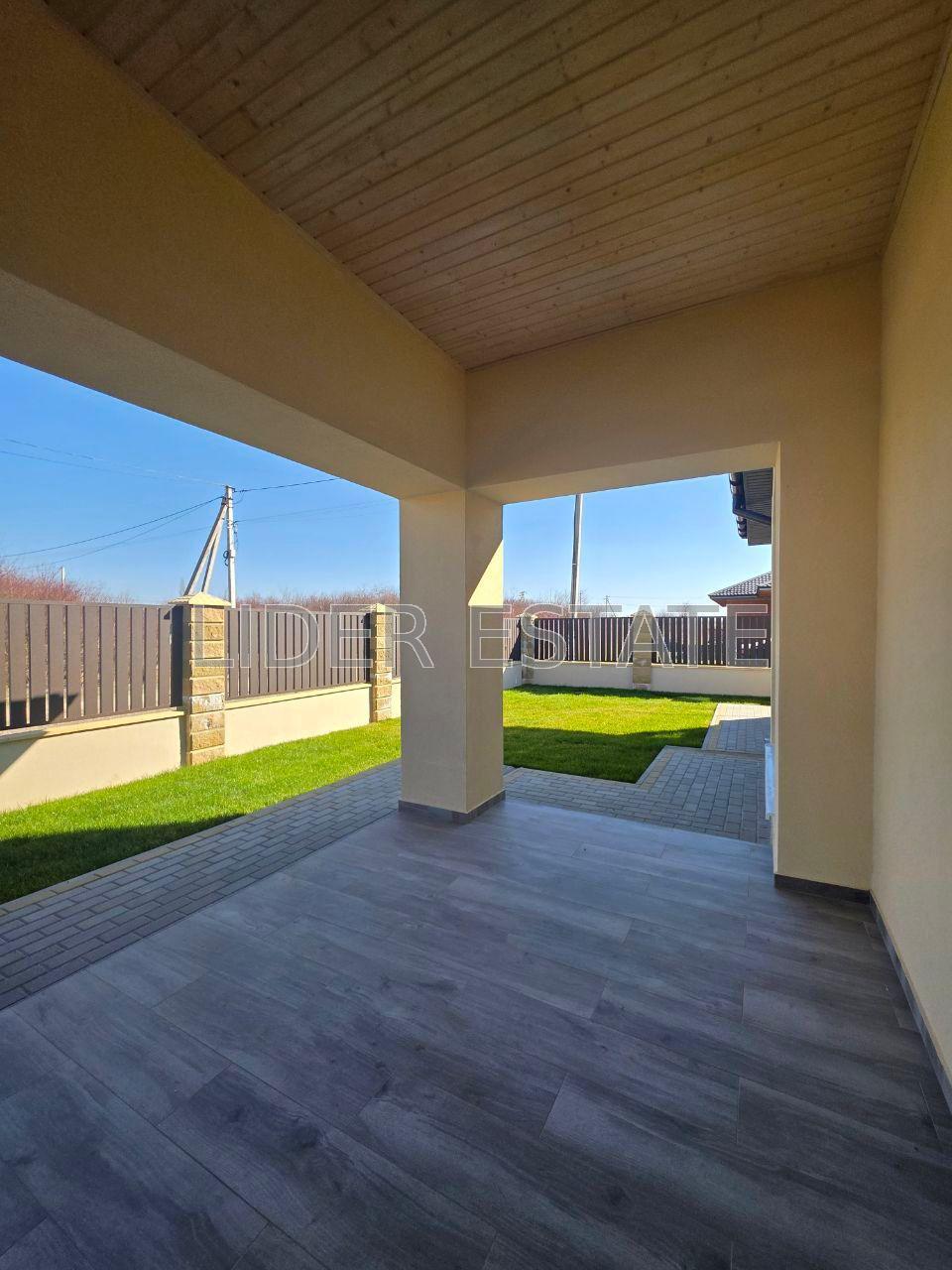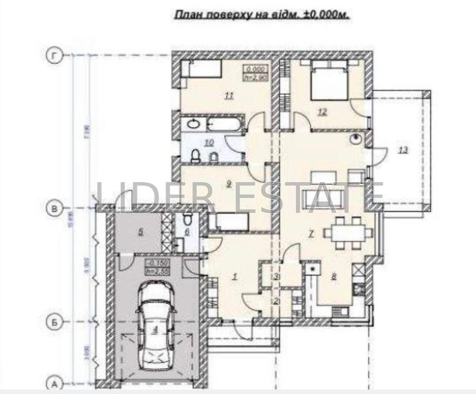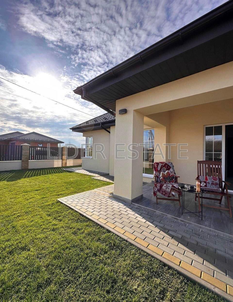 Площа 135 кв.м. Раціональне планування: три кімнати, два санвузли, гардеробна, кладова, гараж з виходом у будинок. Тераса — 20 кв.м.